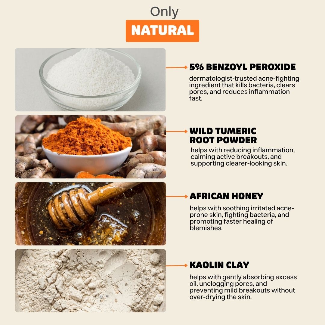 - 5% Benzoyl Peroxide – A dermatologist-trusted acne-fighting ingredient that kills bacteria, clears pores, and reduces inflammation fast.
