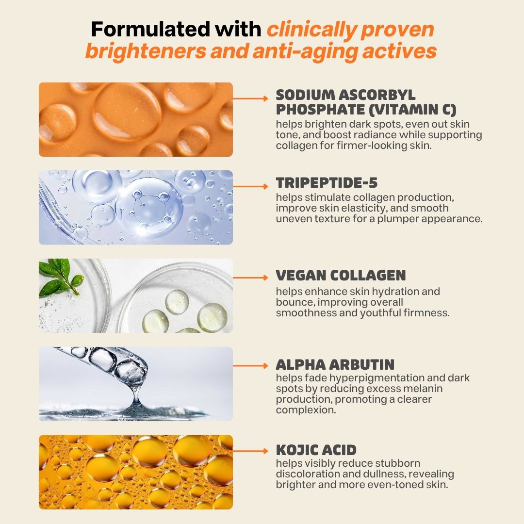 Formulated with clinically proven brighteners and anti-aging actives like Sodium Ascorbyl Phosphate (Vitamin C), Tripeptide-5, Vegan Collagen, Alpha Arbutin, and Kojic Acid, this skin-loving cream targets hyperpigmentation, dullness, and uneven texture while restoring bounce and clarity.