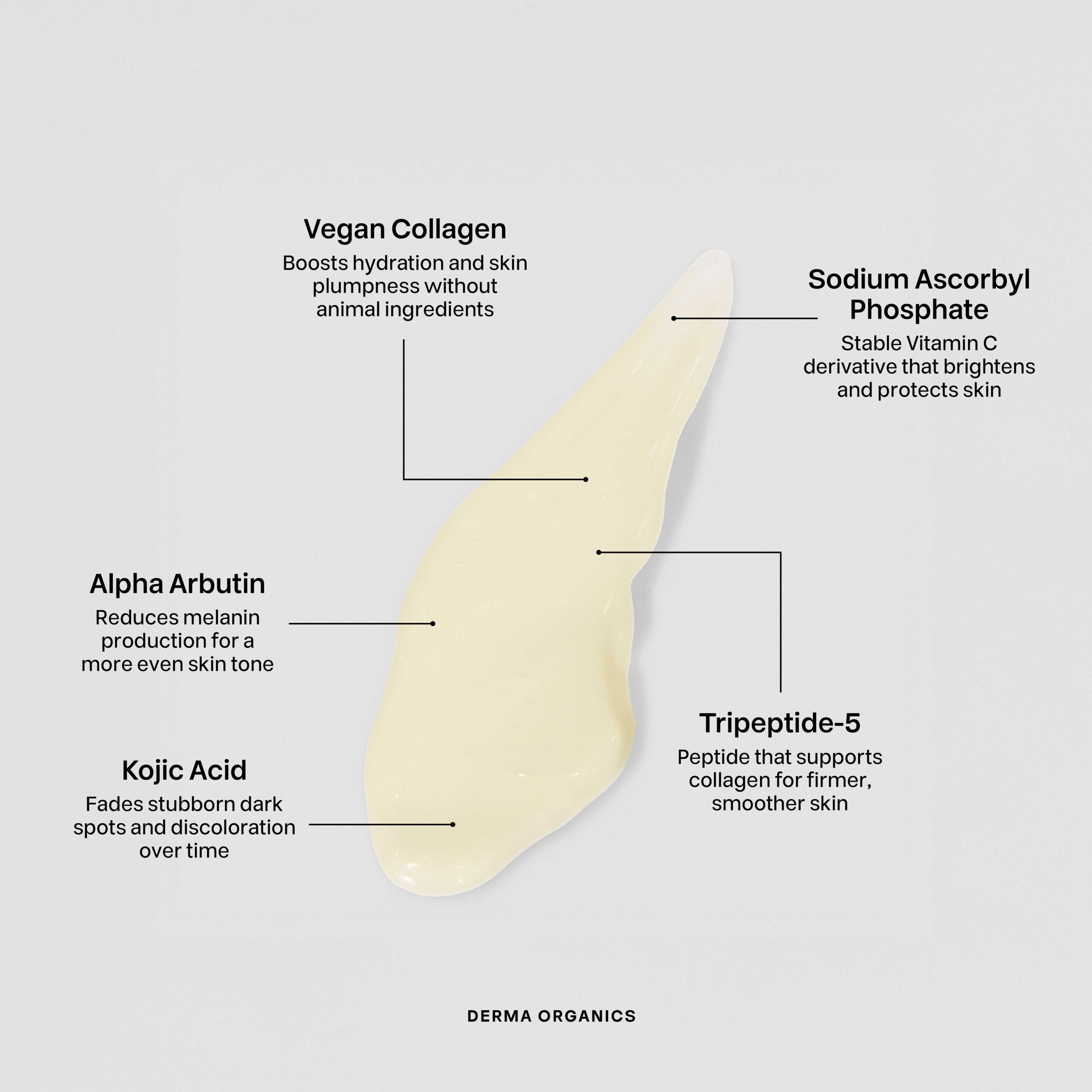 *Organic Aloe Barbadensis Leaf Juice, Ethoxydiglycol, Ascorbic Acid, Butylene Glycol, Glycerin (Vegetable Derived), Ferulic Acid, Sodium Hyaluronate (Hyaluronic Acid), Sodium Phytate, Panthenol, Arbutin, Salicylic Acid, Kojic Acid, Centella Asiatica (Gotu Kola) Extract, 1,2-Hexanediol, Caprylyl Glycol (Plant Extract), Triethanolamine.