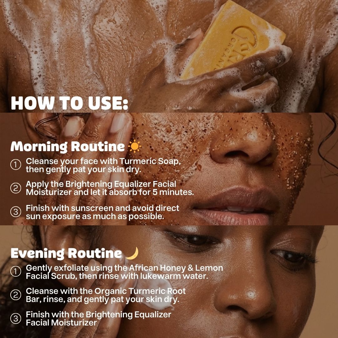 • Thoroughly cleanse with organic Turmeric Root Bar, rinse with lukewarm water, gently pat your skin dry.