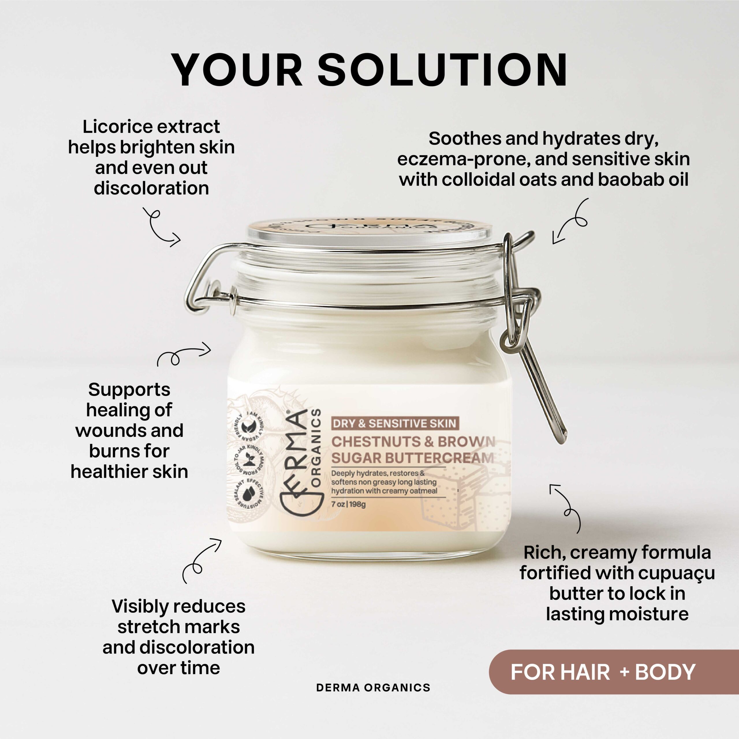 Colloidal oats gently calm inflammation while baobab oil delivers essential fatty acids to repair and nourish the skin barrier. Cupuaçu butter adds rich hydration and elasticity, and licorice extract helps brighten and even skin tone. The comforting chestnuts & brown sugar fragrance oil completes the experience with a warm, inviting scent — without any actual brown sugar in the formula.