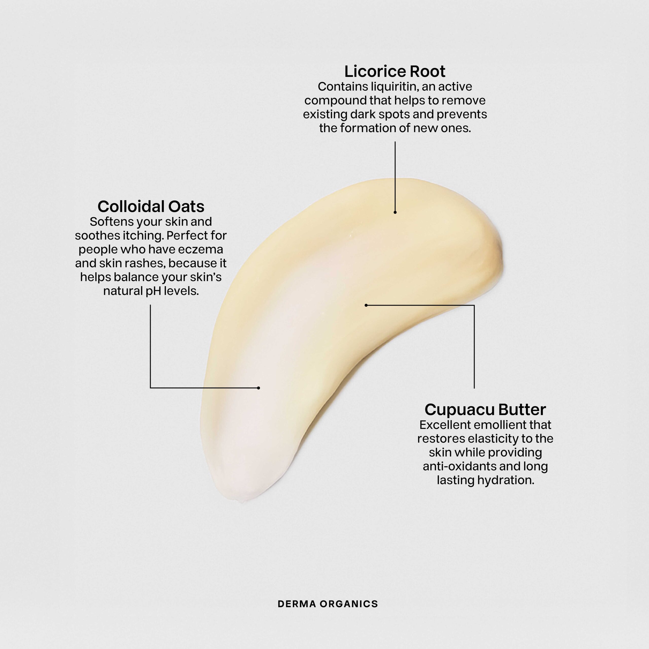 Aqua, Glycerin (Vegetable derived), Glyceryl stearate, Theobroma Grandiflorum (Cupuacu) Seed Butter, Propanediol, Behenyl Alcohol, Adansonia Digitata (Baobab) Oil, Caprylic/ Capric Triglyceride, Theobroma Cacao (Cocoa) Seed Butter, Butyrospermum Parkii (Shea) Butter, Panthenol, Cetearyl Alcohol, Avena Sativa (Oat) Kernel Flour, Mangifera Indica (Mango) Seed Butter, Borago Officinalis (Borage) Seed Oil, Vitis Vinifera (Grapeseed) Oil, Sodium Stearoyl Lactylate, Xylitylglucoside, Parfum, Phenoxyethanol, Anhydroxylitol, Tocopherol, Allantoin, Avena Sativa (Oat) Kernel Extract, Xylitol, Rosmarinus Officinalis (Rosemary) Leaf Oil, Hydrolyzed Oat Protein, Helianthus Annuus (Sunflower) Seed Oil, Xanthan gum, Glycyrrhiza Glabra (Licorice) Root Extract, Glucose, Sodium Phytate, Curcuma Longa Root Extract, Ethylhexylglycerin, Calendula Officinalis (Calendula) Extract, Potassium Sorbate, Sodium Benzoate.